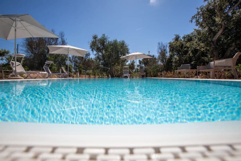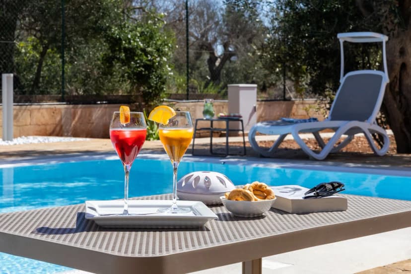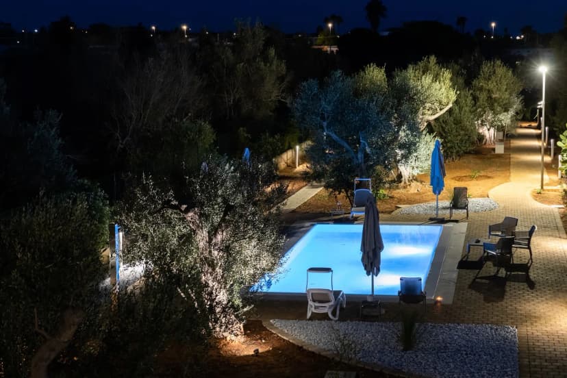 La piscina privata è il cuore della zona esterna: una zona solarium attrezzata con lettini e ombrelloni, pensata per il massimo relax e la privacy. La sua acqua a sfioro appare come una lastra d’argento immobile, capace di riflettere le prime luci dell’alba e il profilo degli ulivi circostanti. La superficie diventa così un sottile velo che separa il paesaggio rurale dal silenzio profondo. Al tramonto, l’atmosfera si fa ancora più suggestiva, perfetta per chiudere la giornata in totale tranquillità.